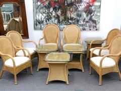 6 ADET OTURMA YERİ VE SIRT KISMI HASIR, BAMBU KOLTUK. 4 ADET CAM TABLALI SEHPA.