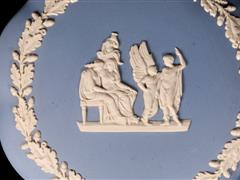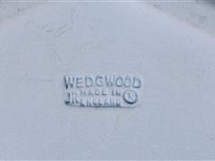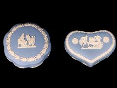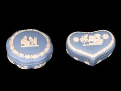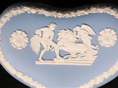 İNGİLİZ. WEDGWOOD. İMALAT DAMGALI. KALP VE YUVARLAK FORMLU. MAVİ ZEMİN ÜZERİ RÖLYEF ÇALIŞMALI.13X9 CM. ÇAP 13 CM.