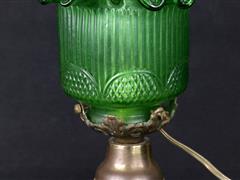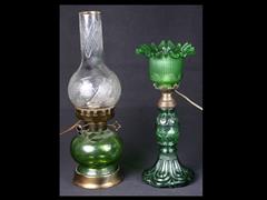 YEŞİL HAZNELİ, ŞEFFAF ŞİŞELİ. H 48 CM. KOYU YEŞİL GÖVDELİ, YEŞİL FANUSLU. H 37,5 CM.