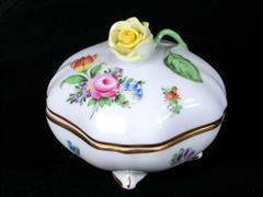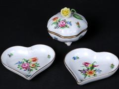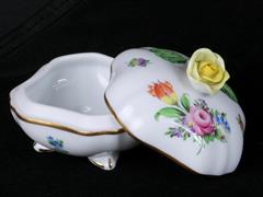 HEREND HVNGARY İMALAT DAMGALI. KALP FORMLU ÇEREZLİK. İÇİ RENKLİ ÇİÇEKLERİLE ALTIN YALDIZ EL DEKORLU.10,5-10 CM. KAPAKLI KUTU. KAPAK TUTAMAĞI GÜL FORMLU. KAPAK ÜSTÜ VE GÖVDE RENKLİ ÇİÇEKLERLE ALTIN YALDIZ EL DEKORLU. 7X7X7 CM. SINIRLI SAYIDA ÜRETİM.