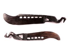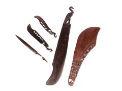 20. YY. AFRİKA ETNİK SANATI. KAZIMA VE OYMA İŞÇİLİKLİ. 2 BÜYÜK, 3 KÜÇÜK PALA. BÜYÜK BOY PALALARDAN BİRİ ABANOZDAN MAMÜL. SAP KISIMLARI MUHTELİF FİGÜRLER İLE DEKORLU. UZ 25-61 CM.