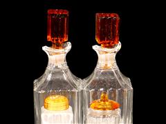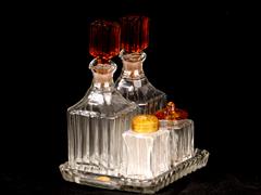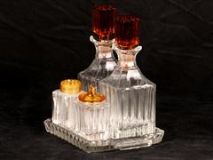 ÇEKOSLOVAK. YAĞLIK, SİRKELİK, TUZLUK, KARABİBERLİK VE TEPSİ. KESME CAM VE RENKLİ KAPAKLI.