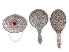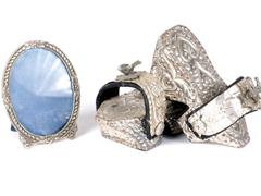 KABARTMA MOTİFLERLE DEKORLU 4 ADET AYNA. UZ 8-11,5 CM. 1 ÇİFT AHŞAP ÜZERİ GÜMÜŞ TAKUNYA. ÜST KISIMLARI GÜVERCİN APLİKELİ. UZ 11 CM.