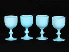 4 ADET TURKUAZ RENKLİ KADEH. H 14 CM. 4 ADET BEYAZ RENK TAŞ OPALİN VAZO. H 10-17 CM. 1 ADET TAŞ OPALİN KAPAKLI ŞEKERLİK.