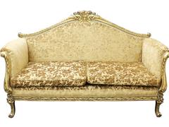 CABRİOLE AYAKLI ÖN BAĞLANTI KOLÇAK ÖNLERİ VE SIRT TACI ALTIN VARAKLI OYMA İŞÇİLİKLİ MOTİFLERLE DEKORLU. SAMAN SARISI DÖŞEMELİ 3 LÜ KANEPE.