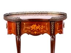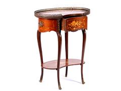BÖBREK FORMLU, MARKÜTERİ İŞÇİLİKLİ, BRONZ APLİKELİ VE TEK ÇEKMECELİ ALT RAFLI. 52X35X70 CM.