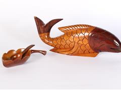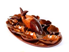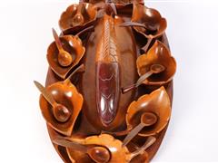HAVYAR VE AYRICA ÇEŞİTLİ DENİZ ÜRÜNLERİ SERVİSİ İÇİN HAZIRLANMIŞ OVAL FORMLU TEPSİDE, 8 ADET KASE VE KAŞIĞI. AYRICA TEPSİ ORTASINDA BALIK FORMLU AHŞAP SÜS OBJESİ İLE GÖRSEL ZENGİNLİK SAĞLANMIŞ. TEPSİ UZ 64X34 CM. KASE 21X10.5 CM.