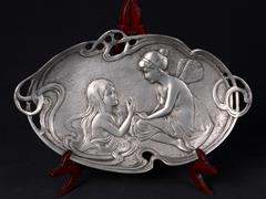 19-20 YY. OVAL FORMLU. ÇİFT TUTAMAKLI. TEPSİ İÇİ KABARTMA GENÇ KIZ VE MELEK TASVİRLİ. 26X16 CM.