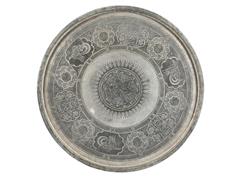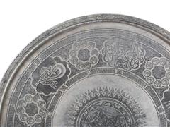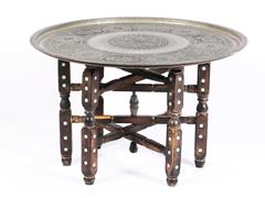 SİNİ KABARTMA VE KAZIMA İŞÇİLİKLİ, TUĞRALAR VE ÇEŞİTLİ MOTİFLERLE DEKORLU. SEDEF KAKMALI VE KATLANIR AHŞAP AYAKLI. ÇAP 71 CM. H 40 CM.