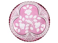 KESME KRİSTAL. GÜL KURUSU RENKLİ, GRAVE İŞÇİLİKLİ KUŞ VE ÇİÇEKLERLE DEKORLU. ÇAP 29,5 CM.