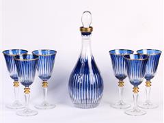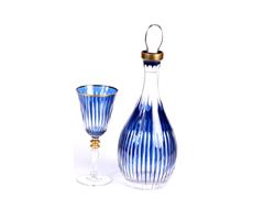 KOBALT RENK VE ALTIN YALDIZ İLE DEKORLU. 6 ADET KADEH. H 20 CM. KARAF H 35 CM.
