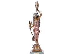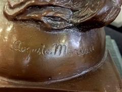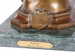 FRANSIZ. AUGUSTE MOREAU İMZALI. (1834-1917) KARE MERMER KAİDE ÜZERİNE ŞAFAK ADLI ALTIN MADALYALI HEYKEL. İKİ LAMBALI. H 71,5 CM. KAİDE 20X20 CM.