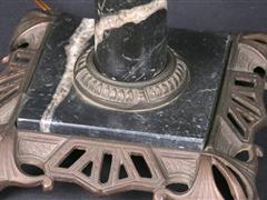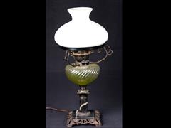 BRONZ KAİDE ÜZERİ MERMER GÖVDELİ. YEŞİL CAM HAZNELİ OPALİN FANUSLU. H 52 CM.