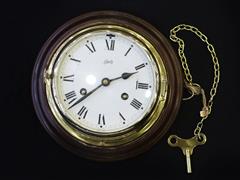 ALMAN. SCHOTZ MARKA, KURMALI, ÇALARLI, YUVARLAK AHŞAP KAİDE ÜZERİNE MONTELİ. ROMEN RAKAMLI. KURMA ANAHTARI MEVCUT. ÇAP 13,5 CM.