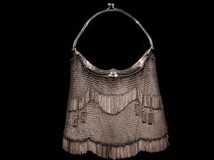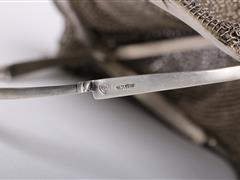 ALMAN. GESCHUTZT BREVETE. İMALAT DAMGALI. 800 AYAR GÜMÜŞ DAMGALI. ZİNCİR İŞİ ÇALIŞMALI. TUTAMAK KISMI KABARTMA ÇİÇEKLERLE DEKORLU. 29,5X20 CM. TOPLAM AĞIRLIK 317 GR.