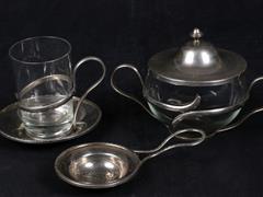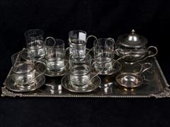 Lot 392 - GÜMÜŞ KAPLAMA VE CAM ÇAY TAKIMI