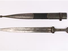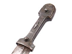 220 YY. KINI DERİ VE GÜMÜŞ ÜZERİ SAVAT İŞÇİLİKLİ MOTİFLERLE DEKORLU. USTA DAMGALI. UZ 69 CM.