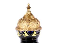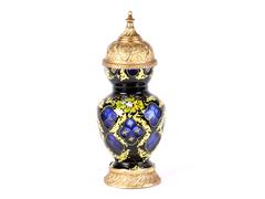 KOLBAT ZEMİN ÜZERİ RENKLİ ÇİÇEKLERLE ALTIN YALDIZ EL DEKORLU. KAİDE VE KAPAK KABARTMA MOTİFLERLE DEKORLU. H 36 CM. ÇAP 11 CM.