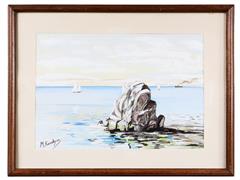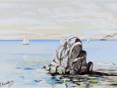 DENİZDE KAYALIK. KARTON ÜZERİ SULUBOYA. İMZALI. 22X31 CM.
