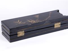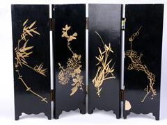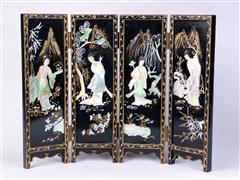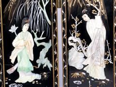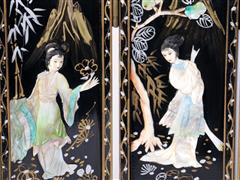 UZAKDOĞU. ÖN YÜZDE UZAKDOĞU FİGÜRLER SEDEF İŞÇİLİKLİ VE ALTIN YALDIZ DEKORLU, ARKA YÜZ DE ALTIN YALDIZ FLORAL DESENLERLE DEKORLU. 4 KATLANIR PARÇALI. H 35,5 CM. UZ 46 CM.