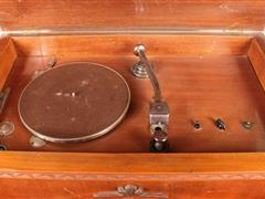 AMERİKAN. E.H.SCOTT RADİO. PKAP VE RADYOLU MÜZİK DOLABI. KABARTMA İŞÇİLİKLİ. YUKARI DOĞRU AÇILIR TABLALI. 82,5X124,5X50 CM.