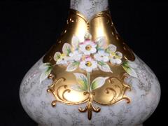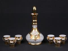 KARAF VE 6 ADET KADEH. KARAF VE KADEH TÜM YÜZEYLERİ ALTIN YALDIZ VE KABARTMA ÇİÇEKLERLE EL DEKORLU. KARAF H 25 CM. KADEH H 5,5 CM.