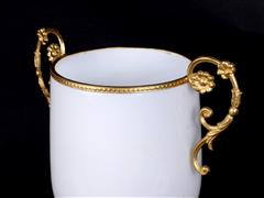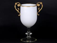 KUPA FORMLU. ŞEFFAF SAPLI. SÜT BEYAZ RENKLİ GÖVDE PİRİNÇ ÇİFT TUTAMAKLI. H 30 CM. ÇAP 13 CM.