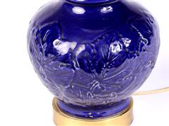 PİRİNÇ KAİDE ÜZERİ KOBALT RENKLİ, UZAKDOĞU FORMLU. KABARTMA DESENLİ. TEK LAMBALI. H 48 CM.