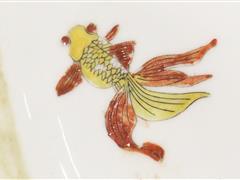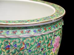 BEYAZ HAMURLU, ŞEFFAF SIRLI. TÜM YÜZEY YEŞİL ÜZERİNE ÇOK RENKLİ FLORAL DESENLERLE DEKORLU. H 37 CM. ÇAP 56 CM.