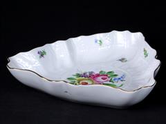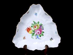 HEREND HVNGARY İMALAT DAMGALI. ÜÇGEN FORMLU, KIVRIMLI KENARLI. TABAK İÇİ VE ÇEVRESİ RENKLİ ÇİÇEKLER VE ALTIN YALDIZ EL DEKORLU. 25,5X24 CM. SINIRLI SAYIDA ÜRETİM.