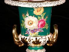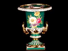 ROYAL PORSELEN İMALAT DAMGALI. KUPA FORMLU. YEŞİL RENKLİ SİLİNDİRİK GÖVDE ÜZERİ RENKLİ ÇİÇEKLERLE DEKORLU. ÇİFT TUTAMAKLI. H 29 CM. ÇAP 23 CM.