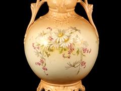 AVUSTURYA İMALAT DAMGALI. ÇİFT TUTAMAKLI, ŞİŞKİN GÖVDE ÜZERİ RENKLİ ÇİÇEKLERLE DEKORLU. H 36,5 CM.
