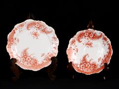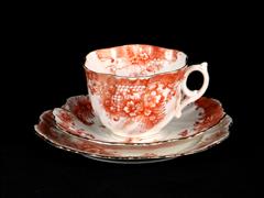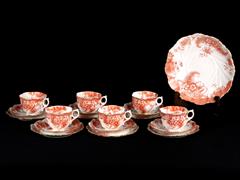 6 ADET 3 LÜ SET, 1 ADET SERVİS TABAĞI. BEYAZ ZEMİN ÜZERİ. TURUNCU RENKLİ BİTKİSEL MOTİFLERLE DEKORLU.