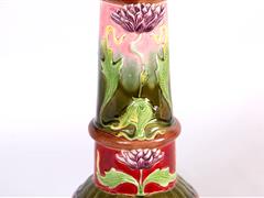 FRANSIZ. 19-20.YY. ART NOUVEAU DÖNEMİ. SERAMİK GÖVDE ÜZERİ KABARTMA RENKLİ ÇİÇEKLERLE DEKORLU. ÜST KISMI BRONZ HEYKEL APLİKELİ. H 70 CM.
