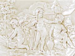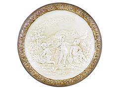 İMALAT DAMGALI. YUVARLAK FORMLU. KABARTMA İŞÇİLİKLİ. PEYZAJDA ÜÇ MELEK FİGÜRLÜ. ÇAP 39 CM.