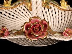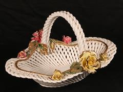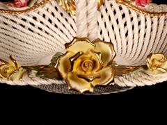 İTALYAN. CAPODİMONTE. OVAL FORMLU. SEPET ÇEVRESİNDE RENKLİ GÜLLER APLİKELİ. ALTIN YALDIZ EL DEKORLU. H 24 CM. 41X31 CM.