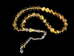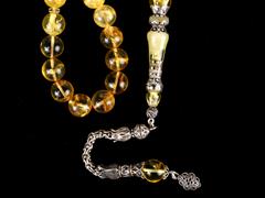 DAMLA KEHRİBAR. KÜRE KESİM. 33 LÜK. İMAME VE PÜSKÜL GÜMÜŞ. TOPLAM AĞIRLIK 33 GR. UZ. 32 CM.