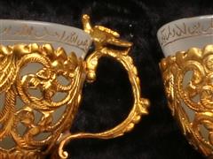 OPALİN FİNCANLAR KAZIMA İŞÇİLİKLİ İHLAS SURESİ YAZILI. ZARFLAR AJUR İŞÇİLİKLİ. ALTIN KAPLAMA. TUTAMAK KISMI GÜVERCİN APLİKELİ. H 6 CM. ORİJİNAL KUTULU.