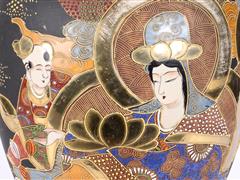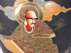 20.YY. JAPON. MALAT DAMGALI. ŞİŞKİN GÖVDELİ. UZAKDOĞU FİGÜRLERLE DEKORLU. RENKLİ ALTIN YALDIZ EL DEKORLU. H 35 CM. ÇAP 12,5 CM.