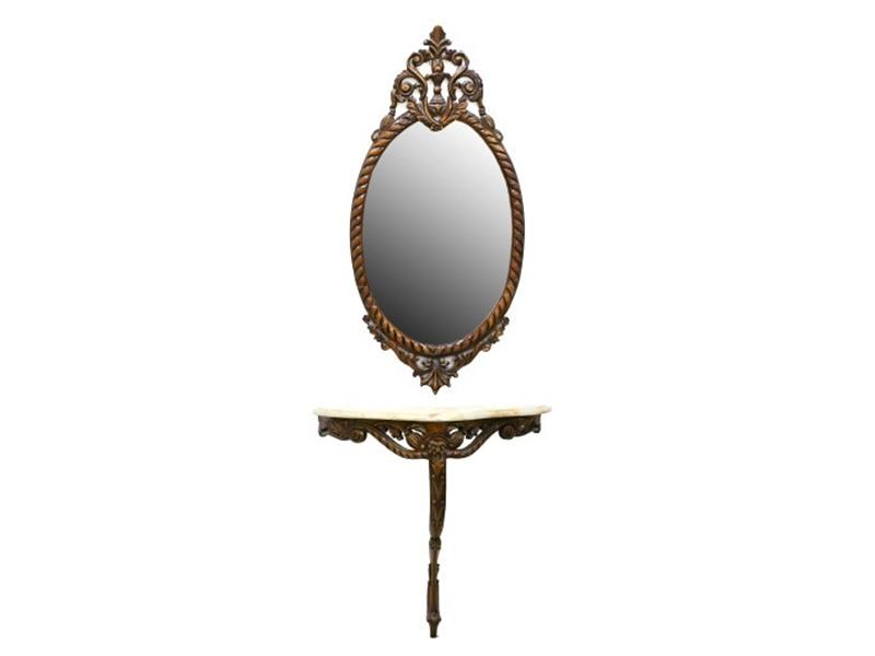 KABARTMA VE OYMA İŞÇİLİKLİ. OVAL FORMLU AYNA. 108X52 CM. MERMER TABLALI TIRNAK 74X26X81 CM.