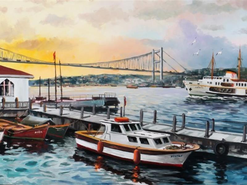 BEYLERBEYİNDEN GÖRÜNÜM. TUAL ÜZERİ YAĞLIBOYA. İMZALI. 100X200 CM.