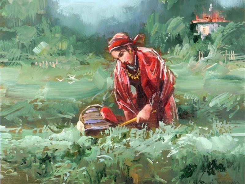 ÇAY HASATI. TUAL ÜZERİ YAĞLIBOYA. İMZALI. 50X60 CM.