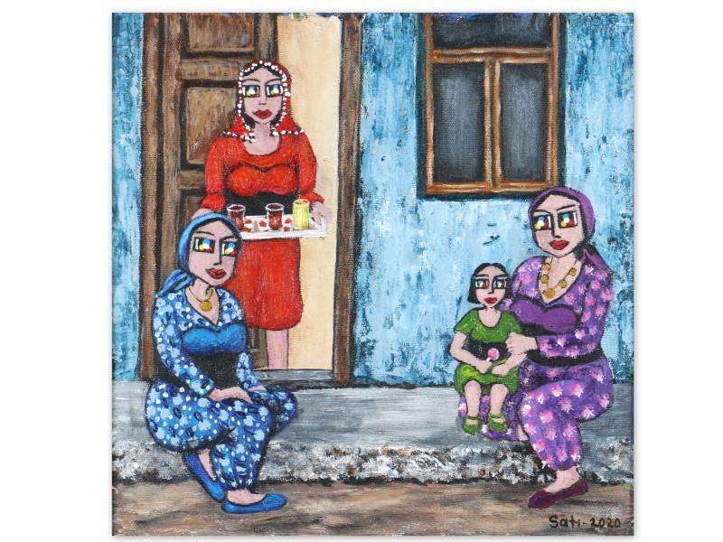 KAPI ÖNÜ FİGÜRLER. TUAL ÜZERİ YAĞLIBOYA. İMZALI. 2020 T. 30X30 CM.