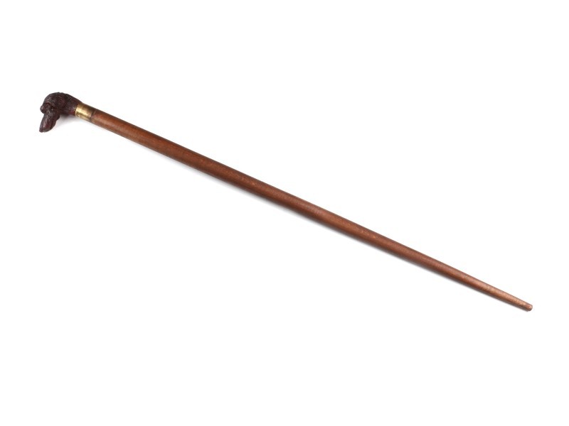 KAYIN AĞACI GÖVDELİ. KATALİN SAPLI KÖPEK BAŞI FİGÜRLÜ KAMA BASTONA GEÇMELİ. UZ 86 CM.