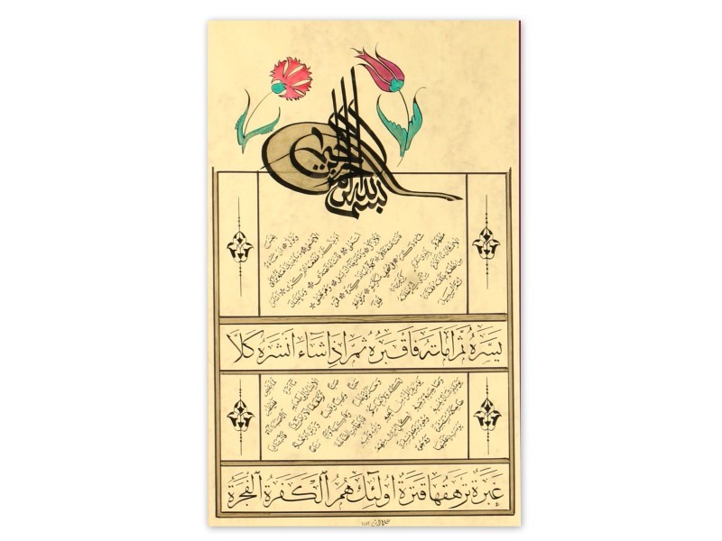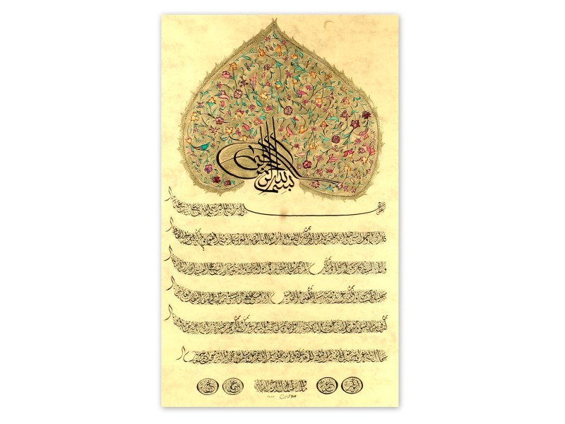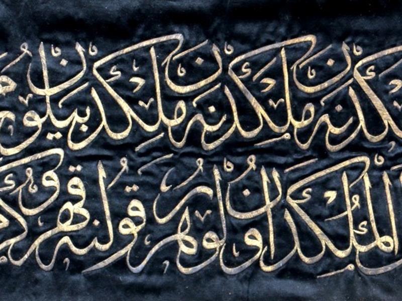 19. YY SONU. SİYAH SATEN KUMAŞ ÜZERİ ALTIN KLAPTEN KULLANILARAK DİVAL İŞİ TEKNİĞİ İLE İŞLENMİŞ. CELİ SÜLÜS HATLA MEHMET ŞEFİK EFENDİ NİN HATTI TATBİK EDİLMİŞ. NE FELEKTEN, NE MELEKTEN, NE MELİKTEN BİLİRİM. MALİK EL MÜLKTEN OLUR HER KULUNA KAHIR VE KELEM. 24X46 CM.
