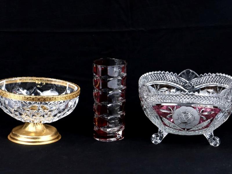 BOHEM MEYVELİK H 13 CM. ÇAP 21 CM. BOHEM VAZO H 17 CM. ÇAP 7,5 CM. PİRİNÇ AYAKLI KRİSTAL ŞEKERLİK H 11 CM. ÇAP 18,5 CM.