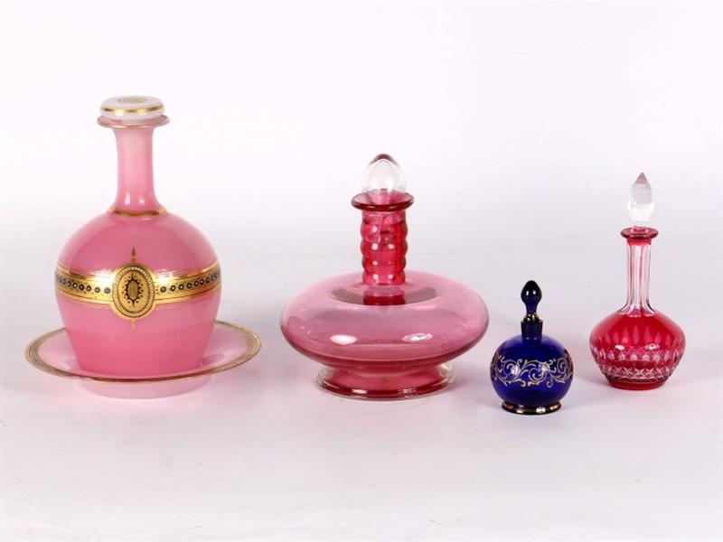 OPALİN TABAKLI KARAF ALTIN YALDIZ DEKORLU, PEMBE RENKLİ. H 20 CM. ÇAP 16 CM. 3 ADET BOHEM KARAF. H 9 - 17 CM.