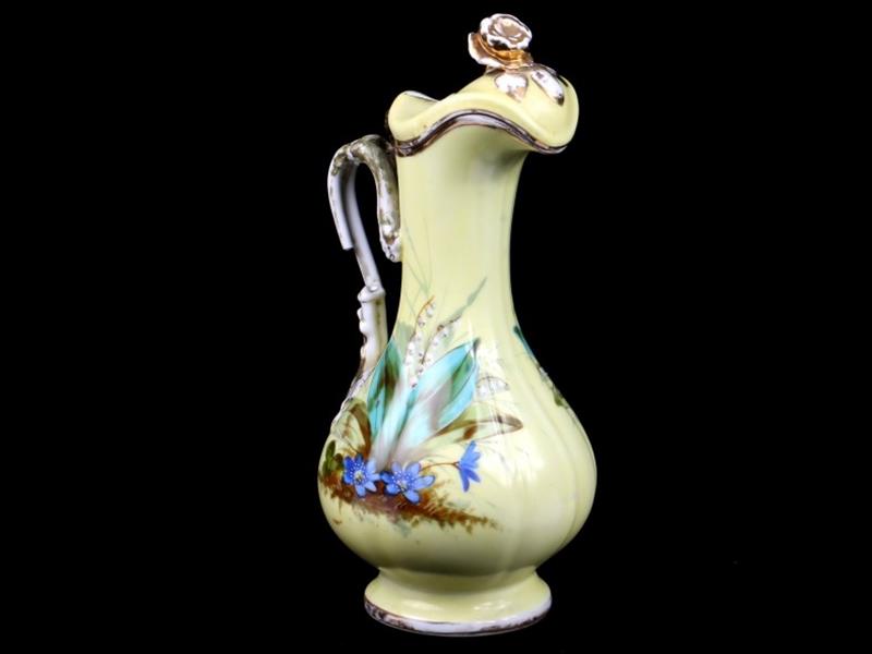 OSMANLI PAZARI İÇİN YAPILMIŞ. İMALAT DAMGALI. BEYAZ HAMURLU. YUVARLAK DİP VE GAGA FORMLU AĞIZ KISMI YALDIZ ŞERİTLİ. ŞİŞKİN GÖVDE ÜZERİ EL BOYAMA ÇİÇEKLERLE SÜSLÜ. KULP KIVRIK DAL, KAPAK ÜSTÜ GÜL FORMLU. H 38 CM.