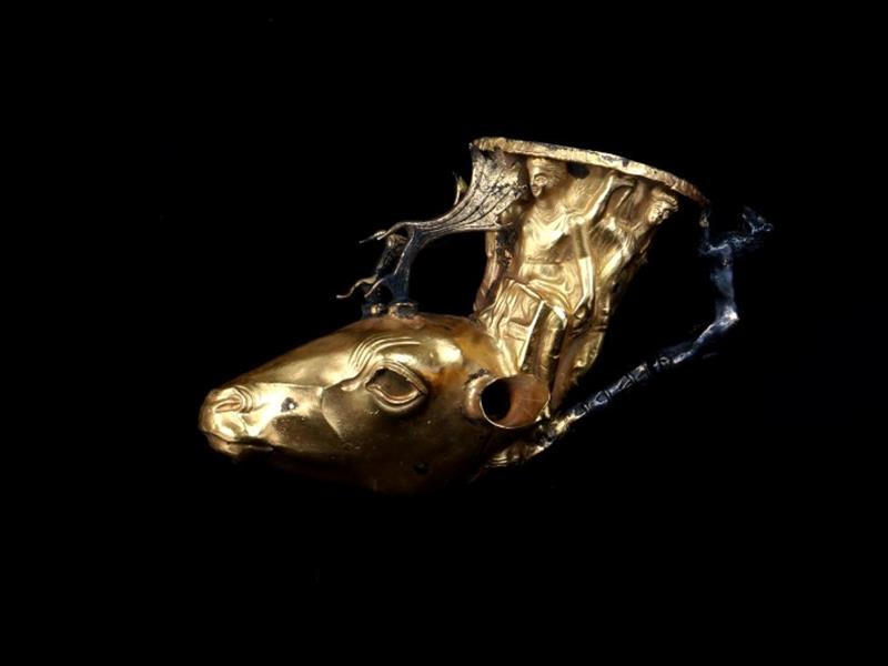 GEYİK BAŞI FİGÜRLE, MİTOLOJİK FİGÜRLER İLE DEKORLU VE ALTIN YALDIZ SIVAMALI. H 14 CM. UZ 22 CM.