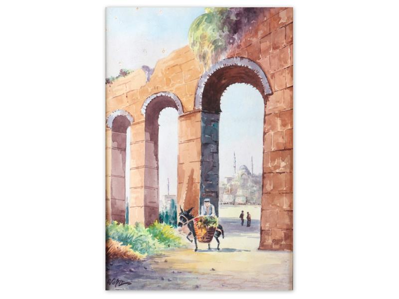 SU KEMERİ ÖNÜNDE SATICI. KAĞIT ÜZERİ SULUBOYA. İMZALI. 40X26,5 CM.